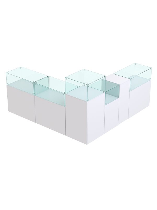 Комплект включает квадратный прилавок с витриной, прилавки с выдвижными ящиками, прилавок с дверцей и выкатной прилавок.