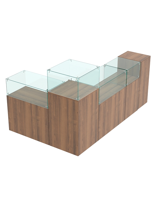 Комплект включает квадратный прилавок с витриной, прилавки с выдвижными ящиками, прилавок с дверцей и выкатной прилавок.