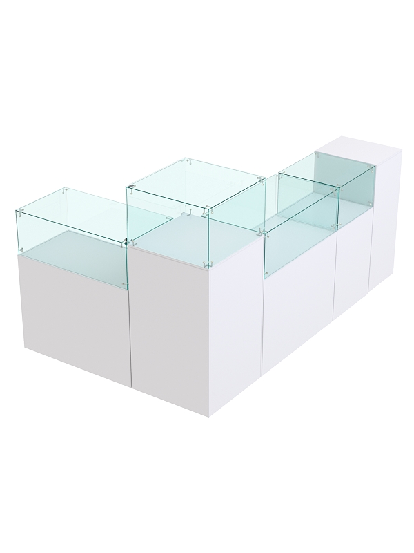Комплект включает квадратный прилавок с витриной, прилавки с выдвижными ящиками, прилавок с дверцей и выкатной прилавок.