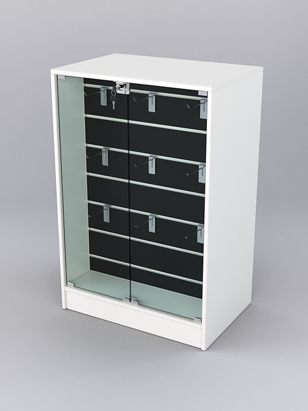 Конструкция прилавка разработана для выкладки предметов кожгалантереи. Демонстрационная панель оборудована крючками. Для представления товара покупателю спереди прилавка имеются дверки. С внутренней стороны располагается накопитель с распашными дверями. Все двери прилавка закрываются на ключ.