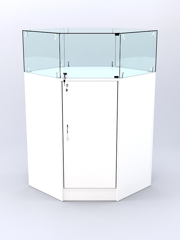 Оригинальный шестигранный прилавок подойдет для выкладки кожгалантерейных изделий, а также дорогих аксессуаров.