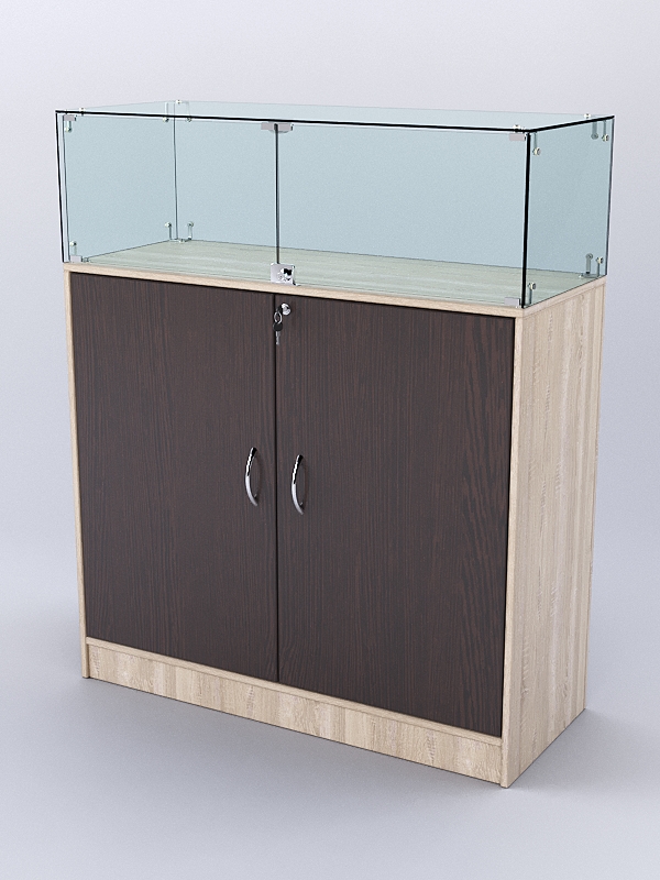 Каркас выполнен из ЛДСП двух цветов. Корпус витрины — стеклянный.
