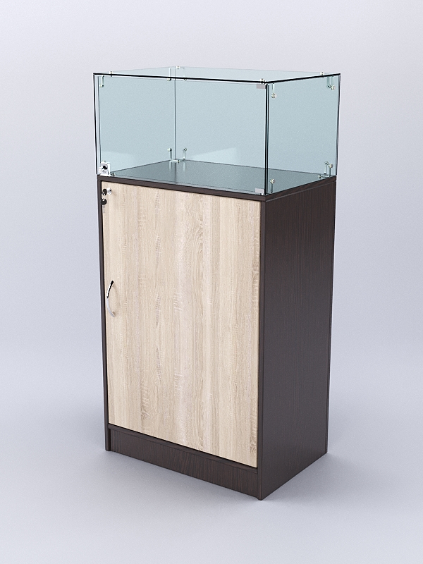 Каркас выполнен из ЛДСП двух цветов. Корпус витрины — стеклянный.