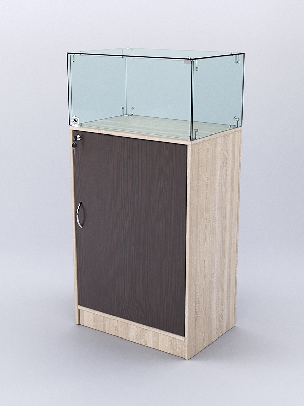 Каркас выполнен из ЛДСП двух цветов. Корпус витрины — стеклянный.