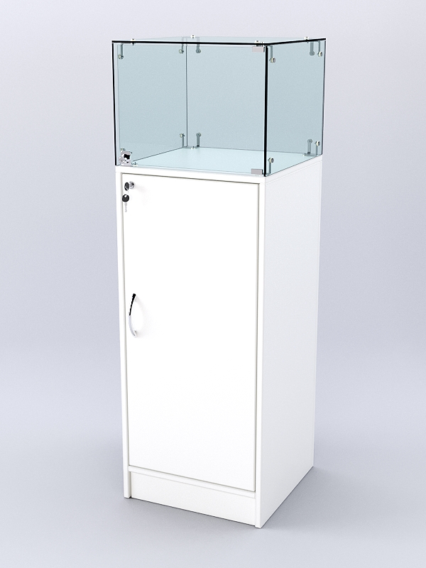 Каркас выполнен из ЛДСП двух цветов. Корпус витрины — стеклянный.