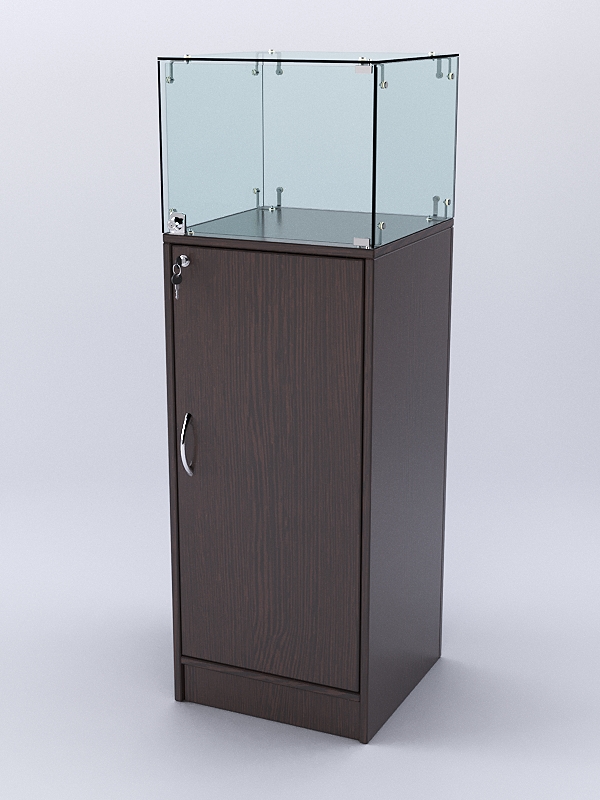 Каркас выполнен из ЛДСП двух цветов. Корпус витрины — стеклянный.