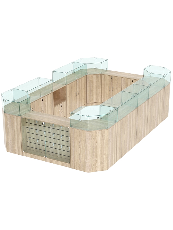 В комплект входят 4 шестигранных прилавка, 2 широких прилавка с демонстрационной панелью, 4 широких прилавка с витриной, узкий прилавок с витриной и выкатной прилавок.