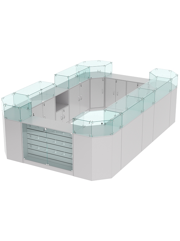 В комплект входят 4 шестигранных прилавка, 2 широких прилавка с демонстрационной панелью, 4 широких прилавка с витриной, узкий прилавок с витриной и выкатной прилавок.