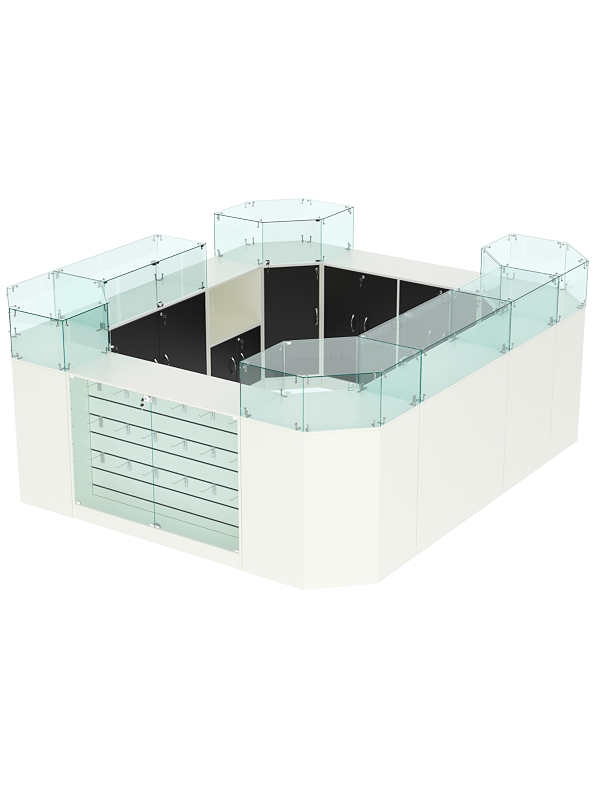 В комплект входят 4 шестигранных прилавка, 2 широких прилавка с витриной, 2 широких прилавка с демонстрационной панелью, узкий прилавок с витриной и выкатной прилавок.