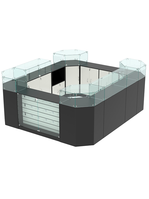 В комплект входят 4 шестигранных прилавка, 2 широких прилавка с витриной, 2 широких прилавка с демонстрационной панелью, узкий прилавок с витриной и выкатной прилавок.