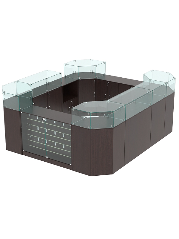 В комплект входят 4 шестигранных прилавка, 2 широких прилавка с витриной, 2 широких прилавка с демонстрационной панелью, узкий прилавок с витриной и выкатной прилавок.