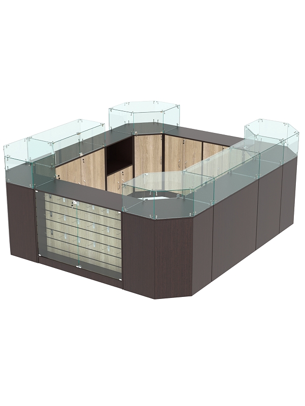 Каркас выполнен из ЛДСП двух цветов. Корпус витрин — стеклянный.