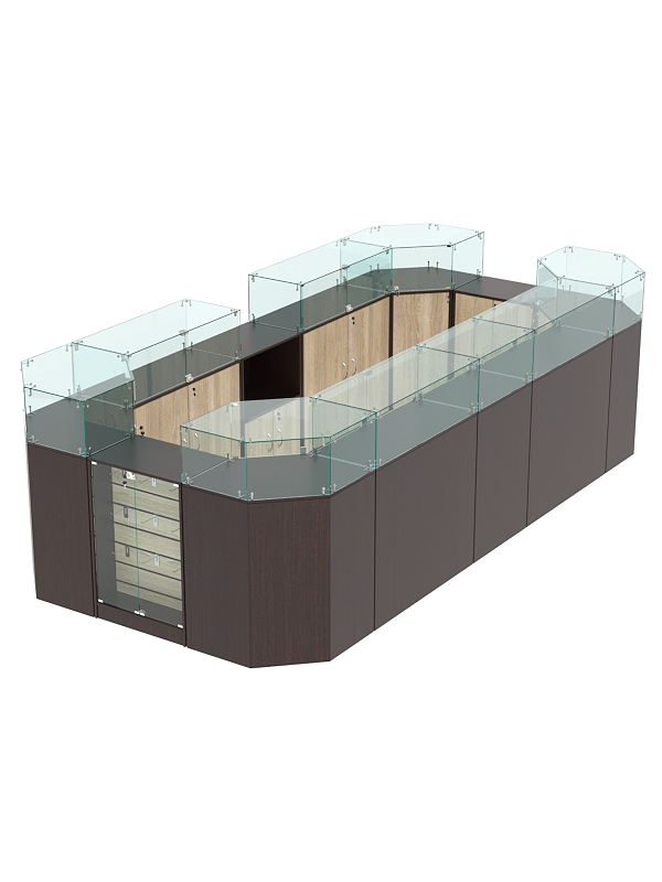 Каркас выполнен из ЛДСП двух цветов. Корпус витрин — стеклянный.