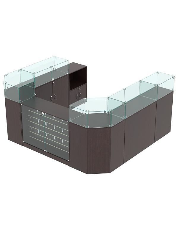 Каркас выполнен из ЛДСП двух цветов. Корпус витрин — стеклянный.