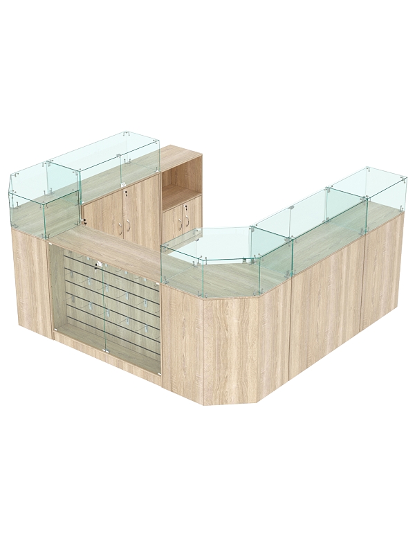 Каркас выполнен из ЛДСП двух цветов. Корпус витрин — стеклянный.