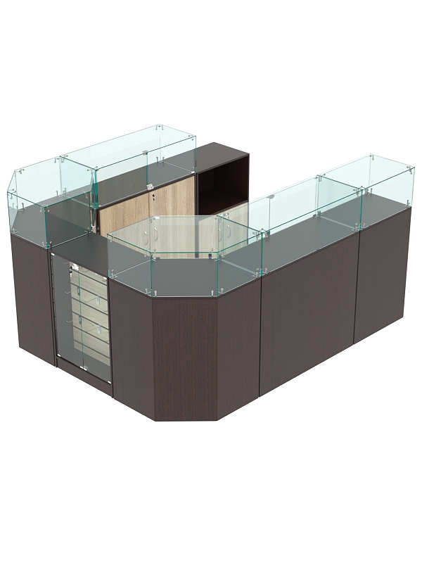 В комплект входят 2 шестигранных прилавка, узкий прилавок с демонстрационной панелью, 2 широких прилавка с витриной, узкий прилавок с витриной и выкатной прилавок.