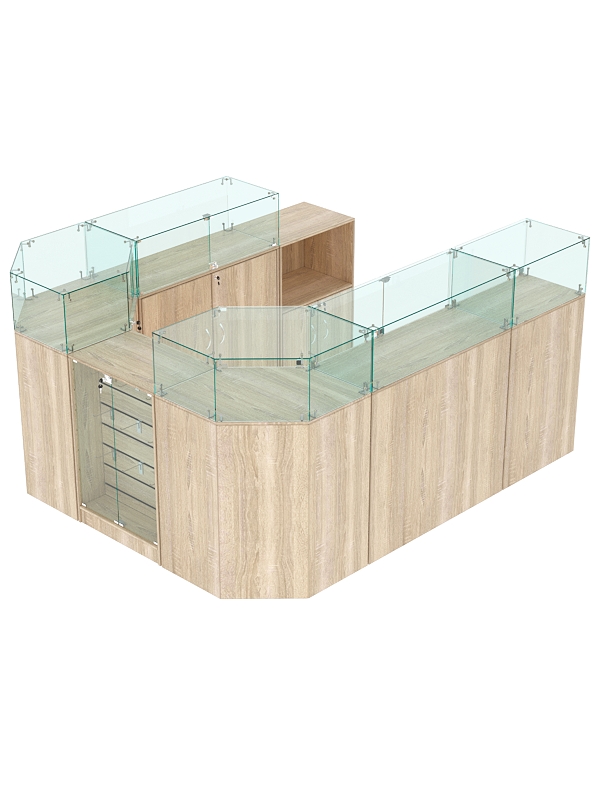 В комплект входят 2 шестигранных прилавка, узкий прилавок с демонстрационной панелью, 2 широких прилавка с витриной, узкий прилавок с витриной и выкатной прилавок.