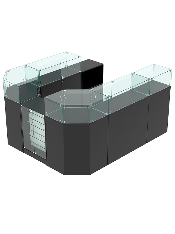Комплект прилавков подойдет для выкладки кожгалантерейных изделий, а также дорогих аксессуаров.