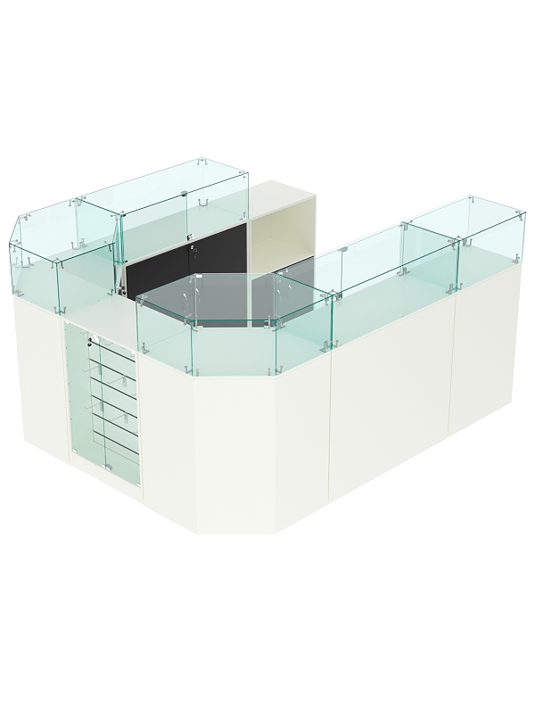 В комплект входят 2 шестигранных прилавка, широкий прилавок с демонстрационной панелью, 2 квадратных прилавка с витриной, узкий прямоугольный прилавок с витриной и выкатной прилавок.