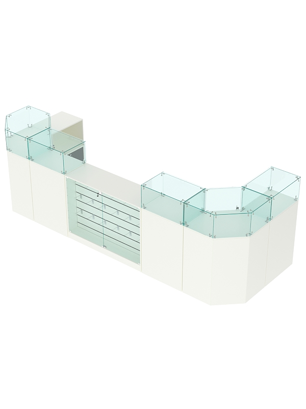 В комплект входят 2 шестигранных прилавка, широкий прилавок с демонстрационной панелью, 3 узких прилавка с витриной и выкатной прилавок.