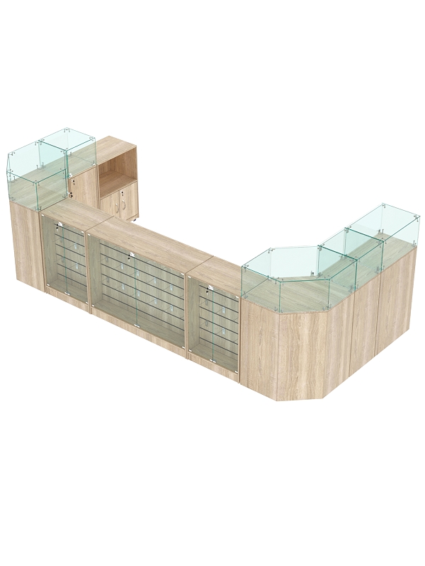 В комплект входят 2 шестигранных прилавка, широкий прилавок с демонстрационной панелью, 2 узких прилавка с демонстрационной панелью, узкий прилавок с витриной и выкатной прилавок.