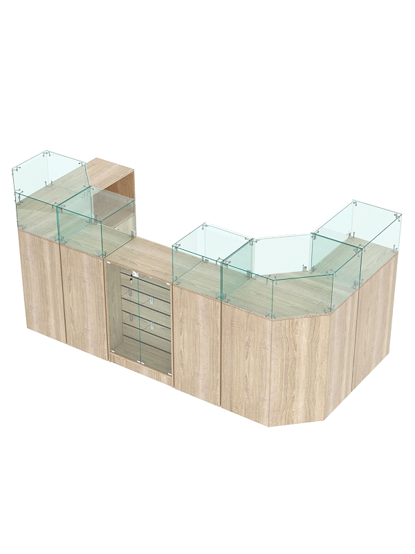 Каркас выполнен из ЛДСП двух цветов. Корпус витрин — стеклянный.