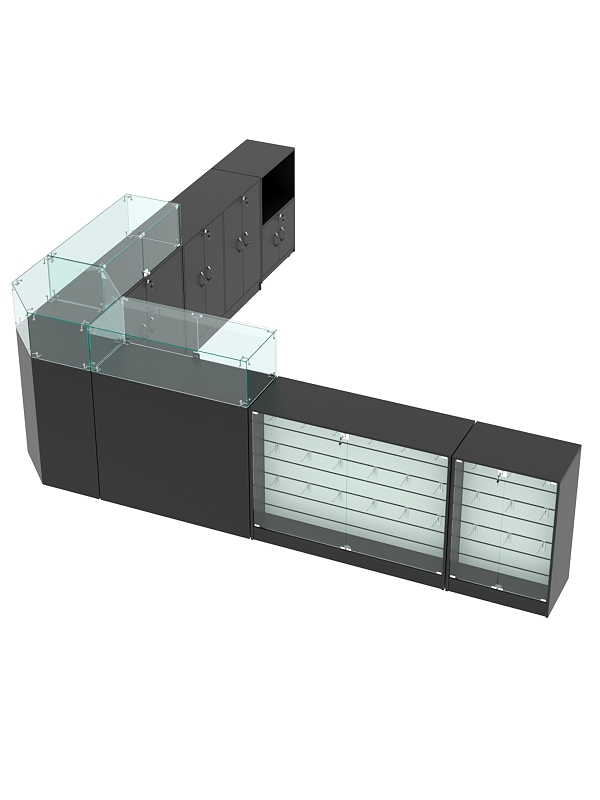 Конструкция представляет собой открытую угловую систему, состоящую из разных моделей прилавков.