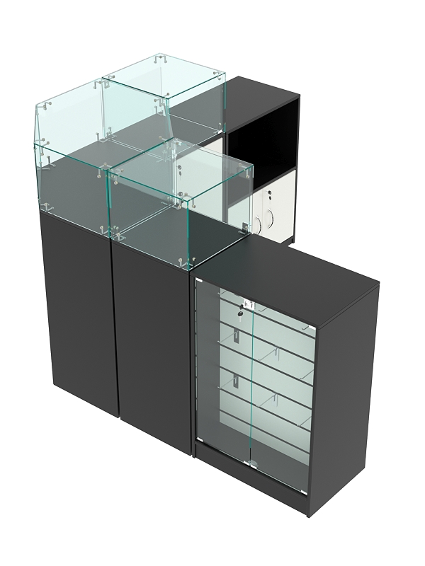 Комплект прилавков подойдет для выкладки кожгалантерейных изделий, а также дорогих аксессуаров.