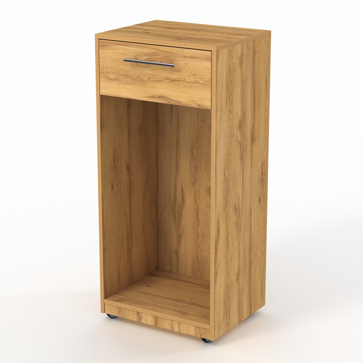 Прилавок предназначен для входа в торговый островок. Для удобного перемещения конструкция оборудована 4-мя колесами. Спереди прилавок полностью закрытый. С внутренней стороны имеется выдвижной ящик и большое отделение для хранения.