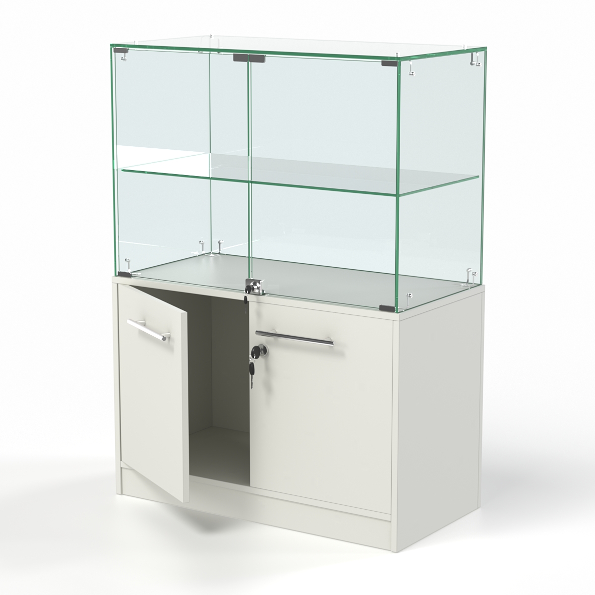 Конструкция состоит из витрины и накопителя. Оба элемента оборудованы двумя распашными дверцами, открывающимися со стороны продавца. Внутри витрины имеется стеклянная полка. При равномерном распределении предметов нагрузка на полку составляет 5-7кг.
