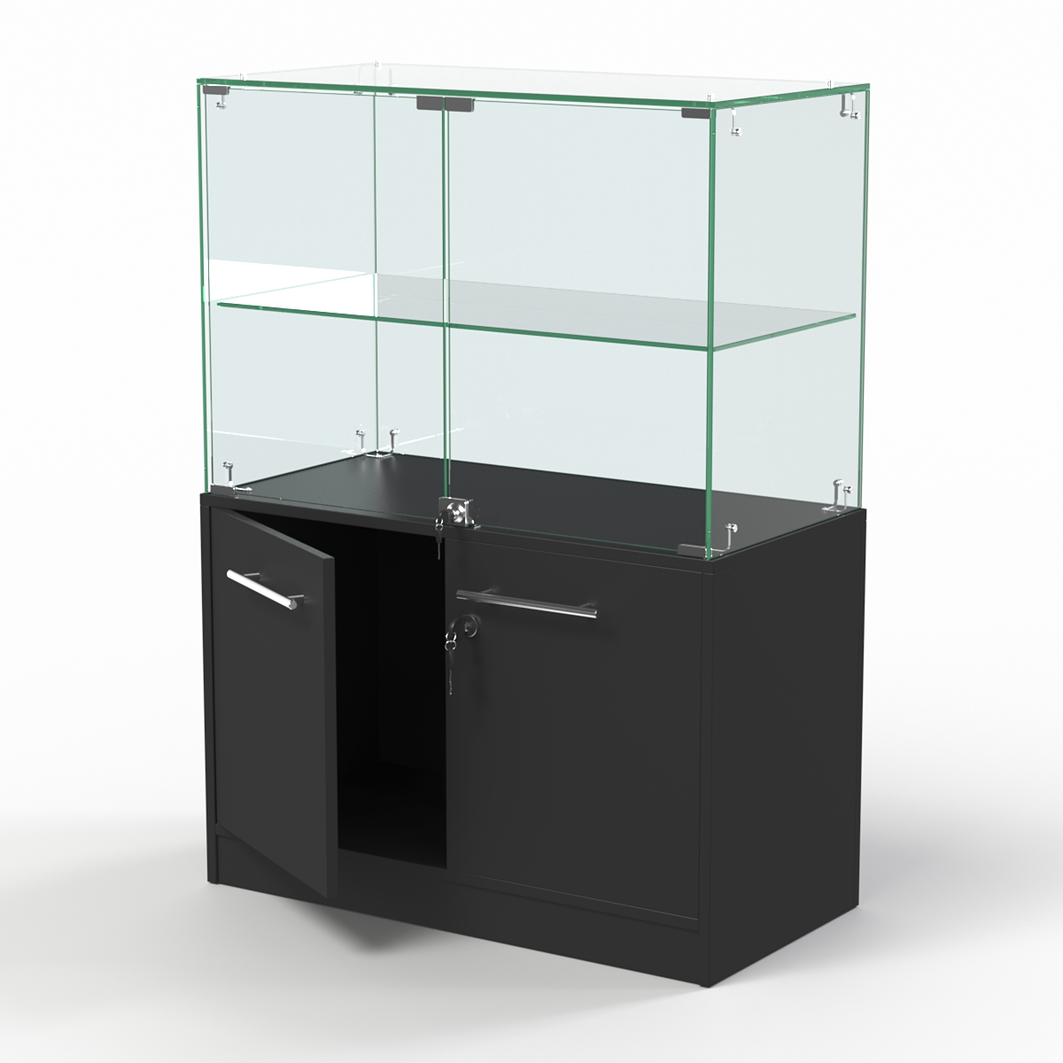 Конструкция состоит из витрины и накопителя. Оба элемента оборудованы двумя распашными дверцами, открывающимися со стороны продавца. Внутри витрины имеется стеклянная полка. При равномерном распределении предметов нагрузка на полку составляет 5-7кг.
