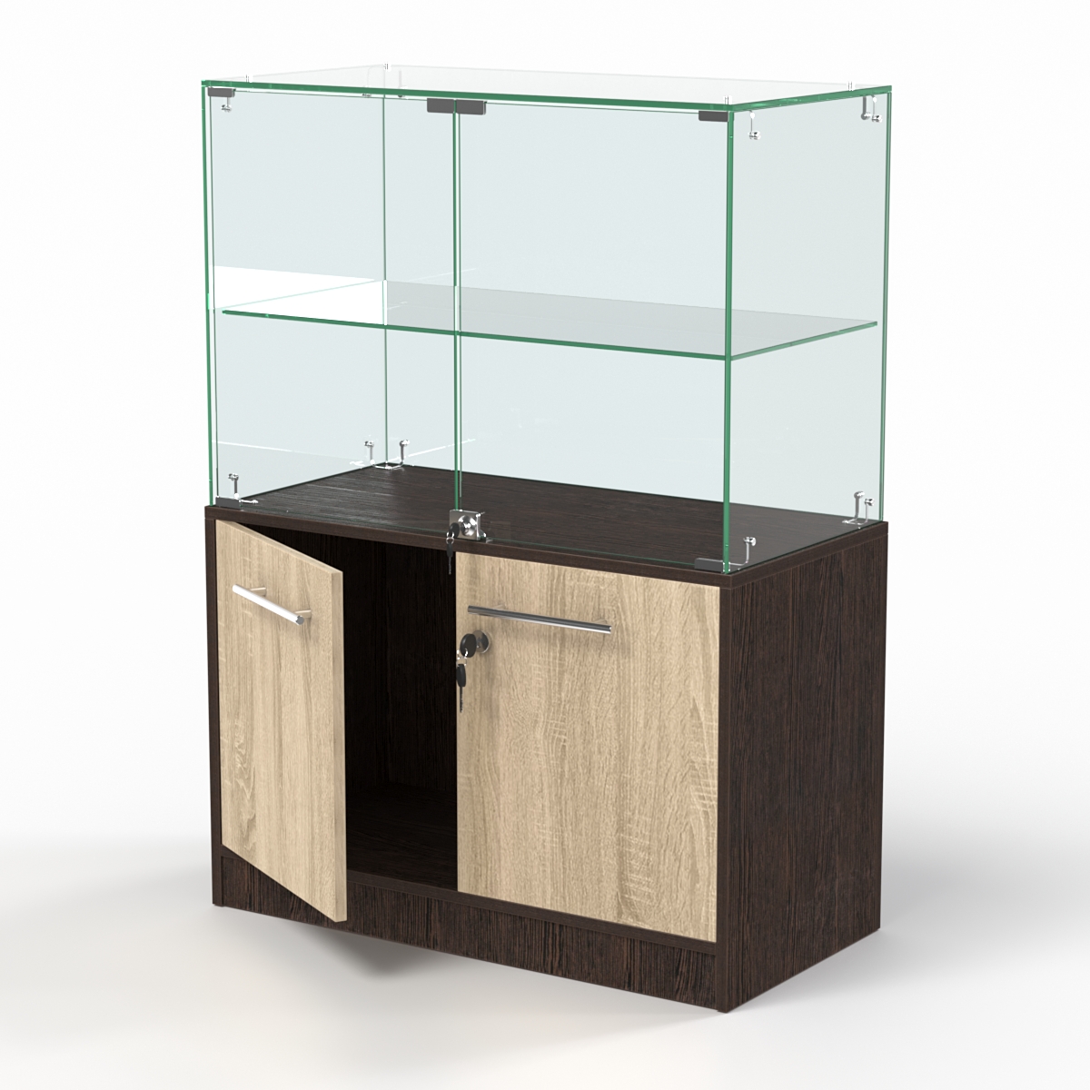 Конструкция состоит из витрины и накопителя. Оба элемента оборудованы двумя распашными дверцами, открывающимися со стороны продавца. Внутри витрины имеется стеклянная полка. При равномерном распределении предметов нагрузка на полку составляет 5-7кг.