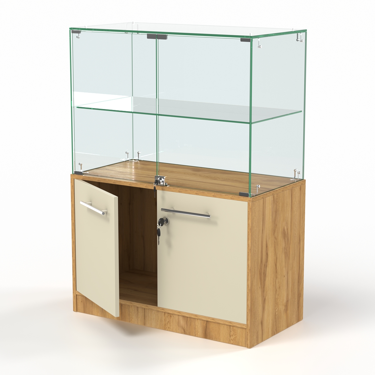 Конструкция состоит из витрины и накопителя. Оба элемента оборудованы двумя распашными дверцами, открывающимися со стороны продавца. Внутри витрины имеется стеклянная полка. При равномерном распределении предметов нагрузка на полку составляет 5-7кг.