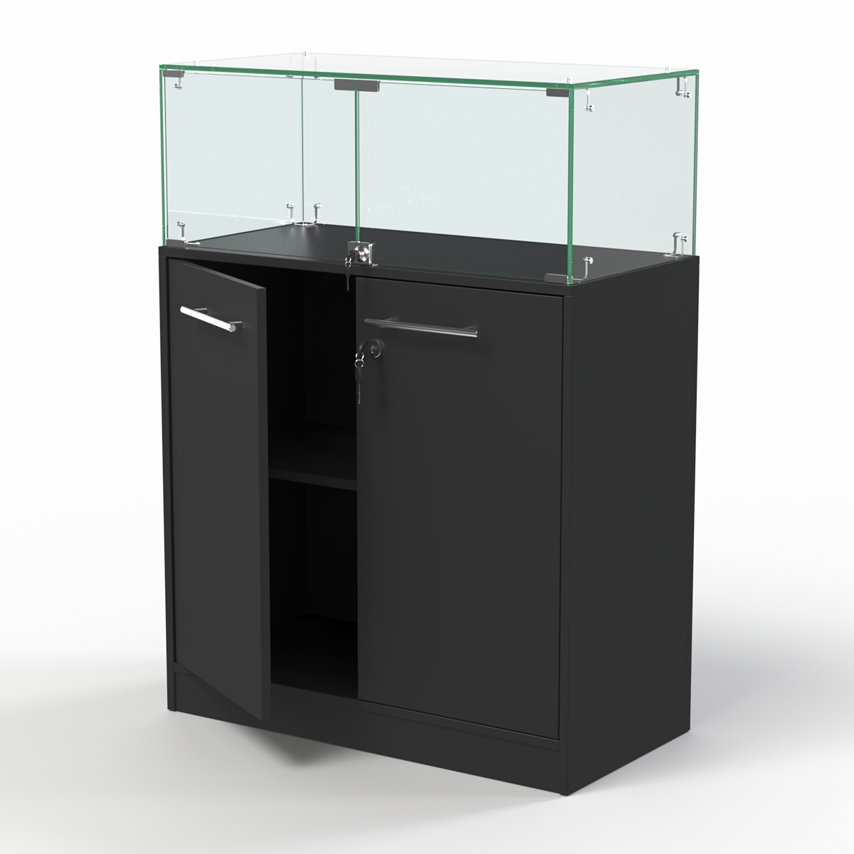 Накопитель изготовлен из ЛДСП, корпус витрины — стеклянный.
