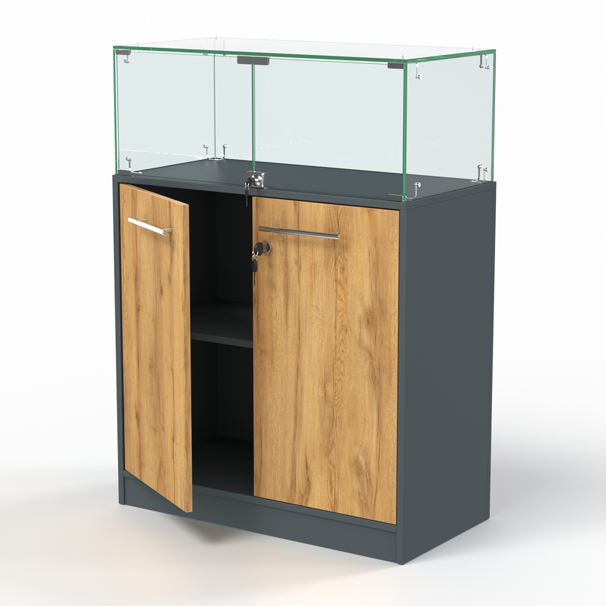 Накопитель изготовлен из ЛДСП, корпус витрины — стеклянный.