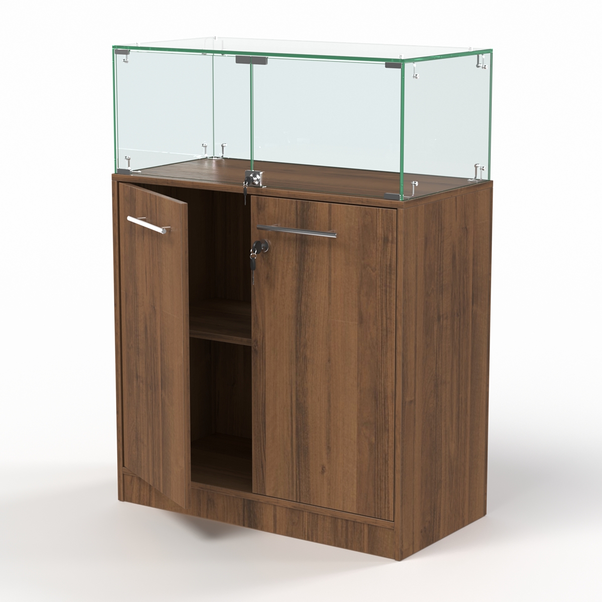 Накопитель изготовлен из ЛДСП, корпус витрины — стеклянный.