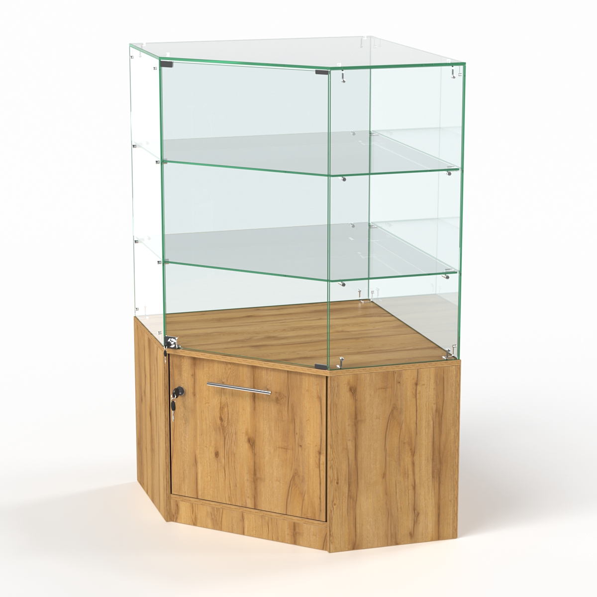 Накопитель изготовлен из ЛДСП, корпус и полки витрины — стеклянные. При равномерном распределении предметов нагрузка на полку составляет 5-7кг.