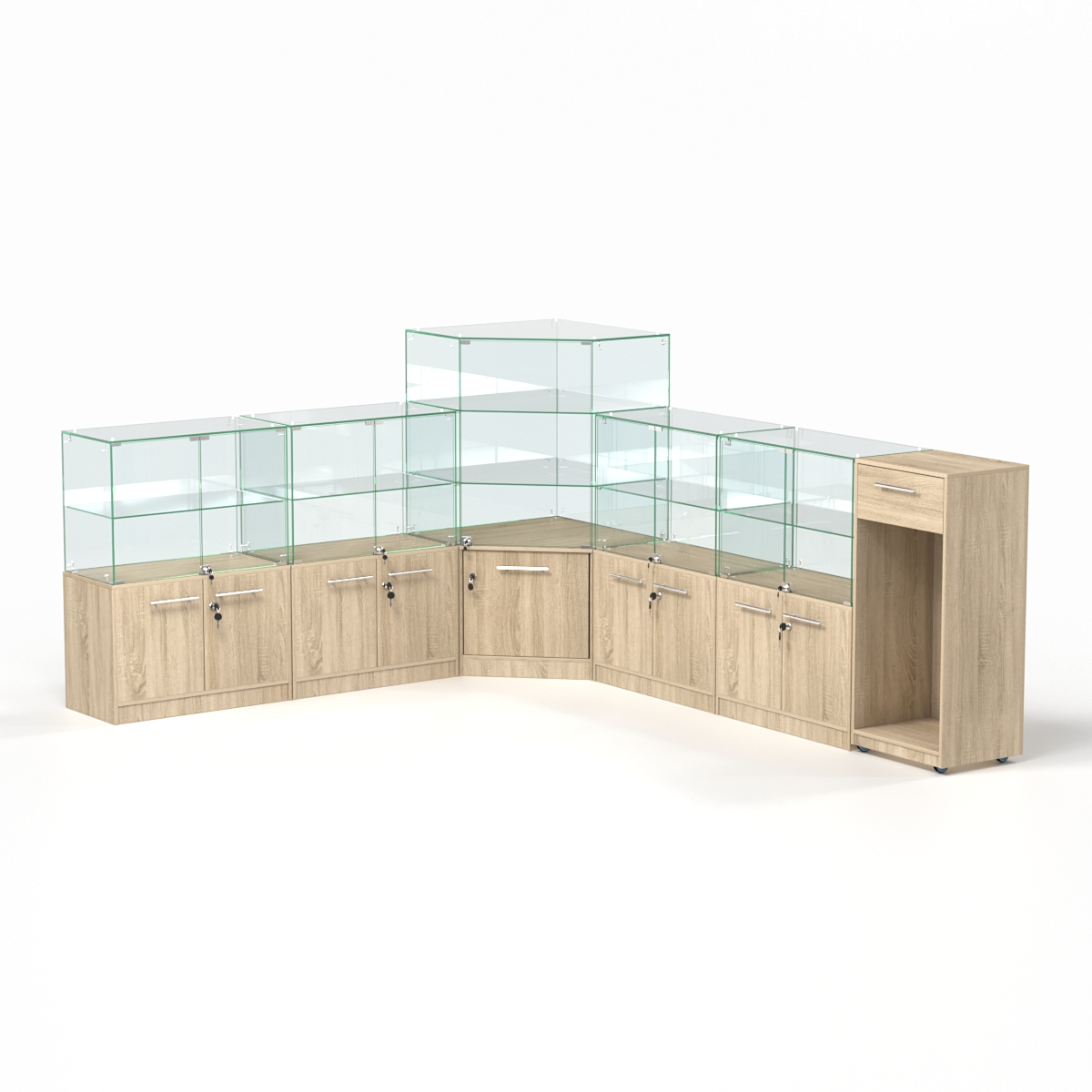 Комплект включает четыре прямоугольных прилавка, пятиугольный и закрытый прилавки.