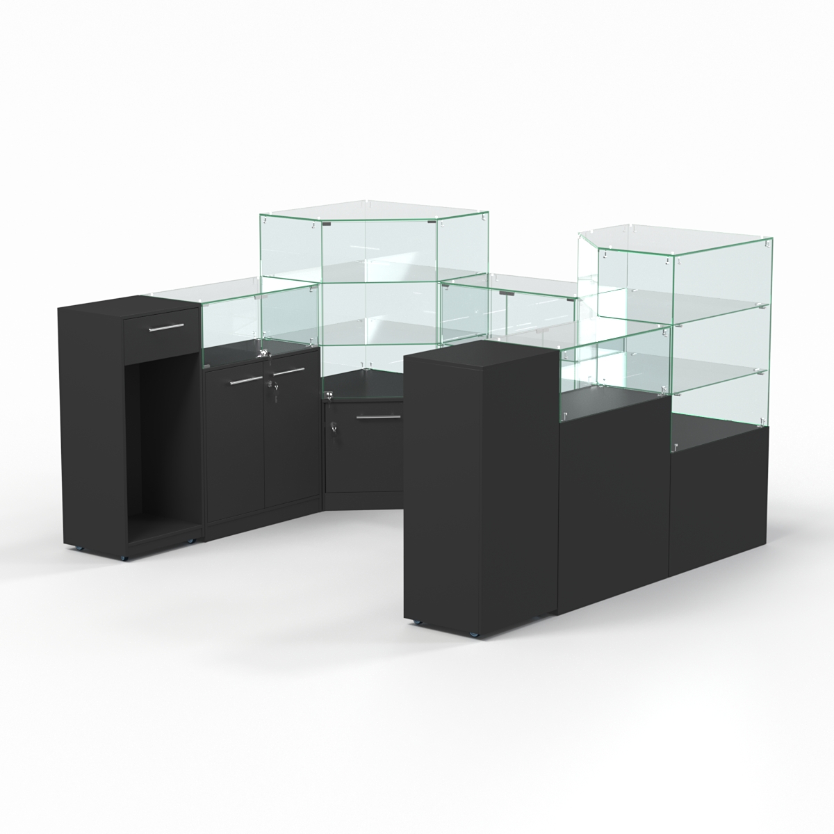 Комплект включает два пятиугольных прилавка, один прямоугольный и два закрытых прилавка.