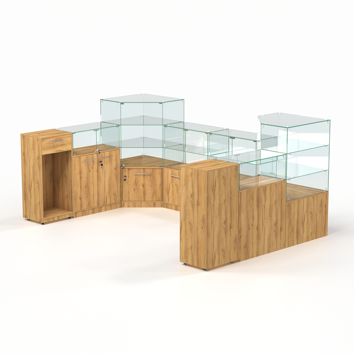 Комплект включает четыре прямоугольных прилавка, два пятиугольных и два закрытых прилавка.