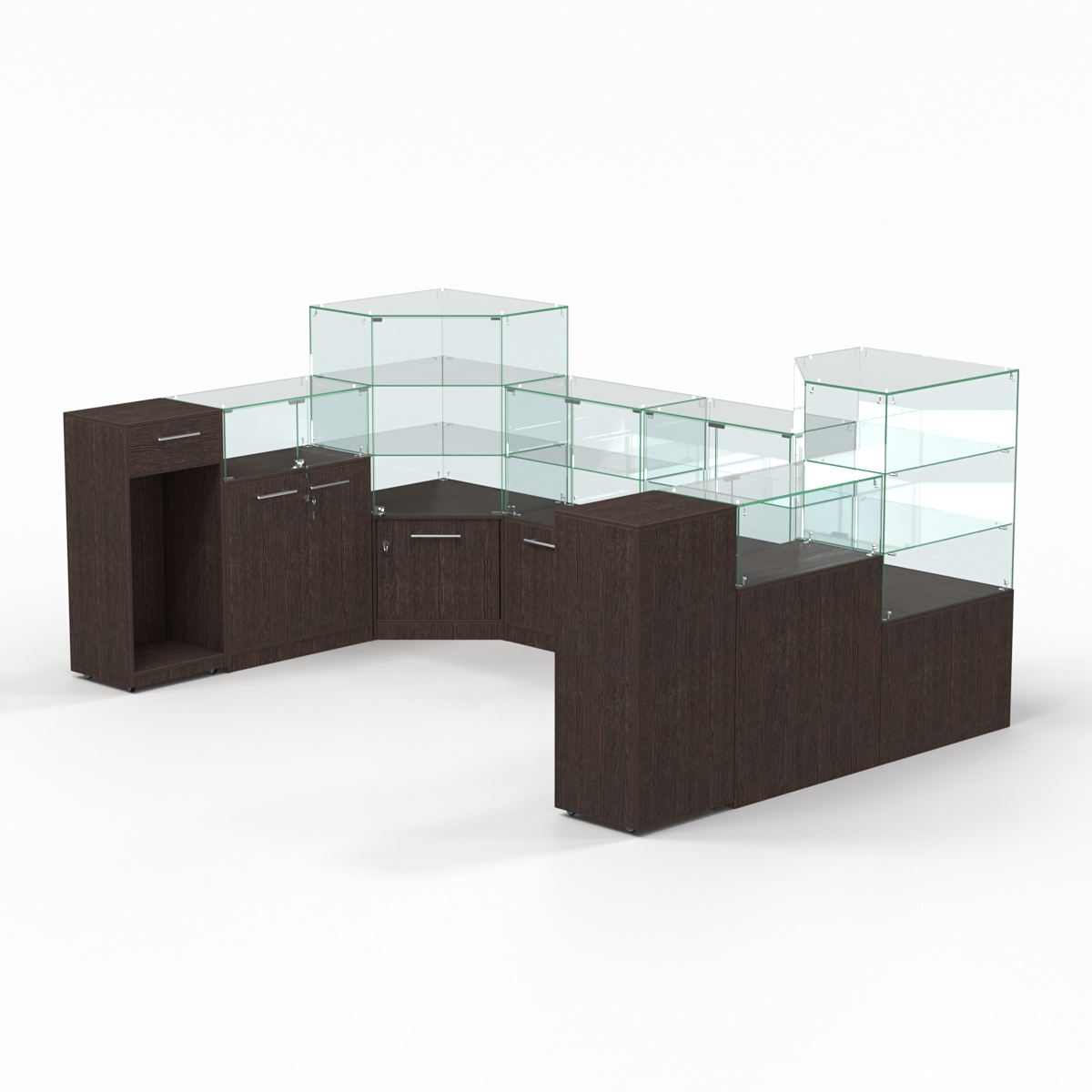 Комплект включает четыре прямоугольных прилавка, два пятиугольных и два закрытых прилавка.