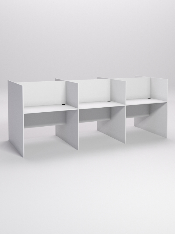 Стол предназначен для комфортной работы оператора колл-центра. Двухсторонняя конструкция состоит из трех секций, образуя шесть рабочих мест. Фронтальная и боковые стенки — прямые. Каркас выполнен из ЛДСП. Имеется семь стандартных расцветок. Другие цвета подбираются в палитре на заказ.