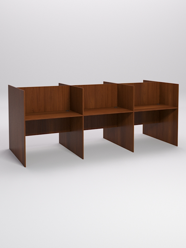 Стол предназначен для комфортной работы оператора колл-центра. Двухсторонняя конструкция состоит из трех секций, образуя шесть рабочих мест. Фронтальная и боковые стенки — прямые. Каркас выполнен из ЛДСП. Имеется семь стандартных расцветок. Другие цвета подбираются в палитре на заказ.