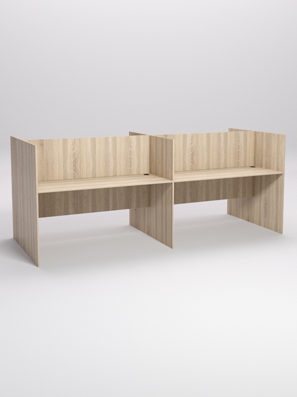 Стол предназначен для комфортной работы оператора колл-центра. Двухсторонняя конструкция состоит из двух секций, образуя четыре рабочих места. Фронтальная и боковые стенки — прямые. Каркас выполнен из ЛДСП. Имеется семь стандартных расцветок. Другие цвета подбираются в палитре на заказ.