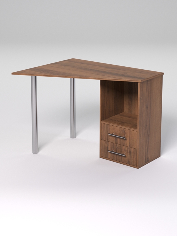 Компактный офисный компьютерный стол подойдет для оборудования рабочего места в помещении с ограниченной площадью. Угловая форма стола позволяет экономно использовать рабочее пространство. Конструкция состоит из столешницы скошенной формы, двух металлических опор и тумбы с отделением и двумя выдвижными ящиками. Левосторонняя ориентация.