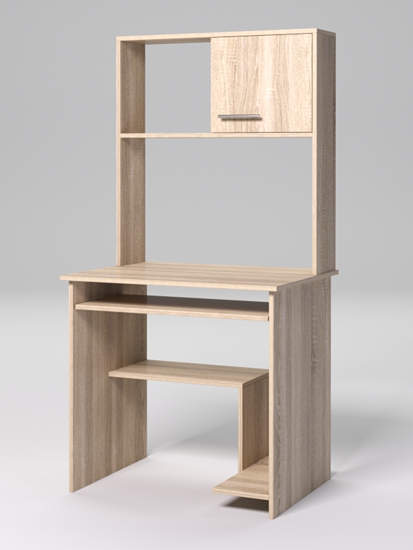 Офисный компьютерный стол подойдет для полноценной организации рабочего места в помещениях с ограниченной площадью. Стол оборудован полкой под клавиатуру, подставкой под системный блок, полкой для хранения. Сверху находится надстройка с полкой и шкафчиком.