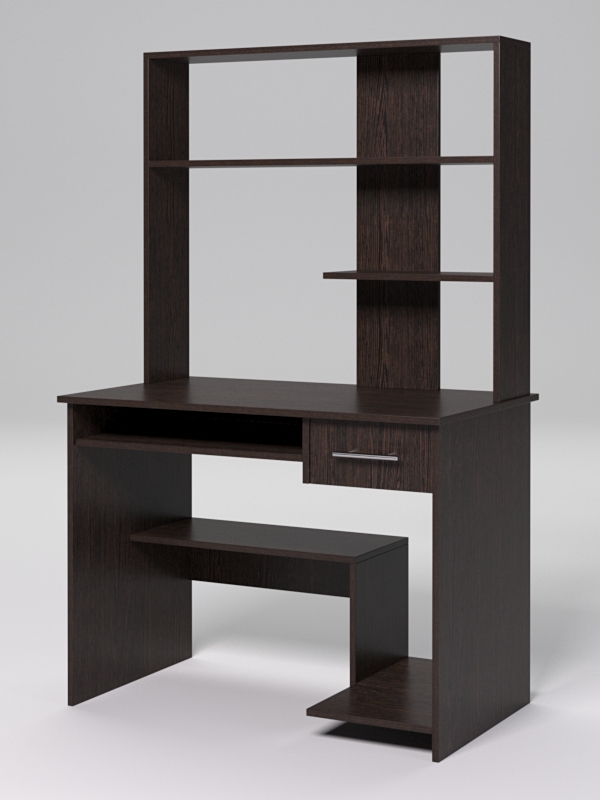 Офисный компьютерный стол оборудован всем необходимым для комфортной работы оператора. Конструкция стола включает полку под клавиатуру, подставку под системный блок, полку и выдвижной ящик. Сверху находится надстройка с двумя полками.