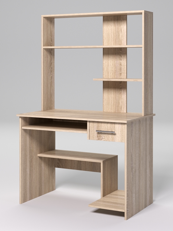 Офисный компьютерный стол оборудован всем необходимым для комфортной работы оператора. Конструкция стола включает полку под клавиатуру, подставку под системный блок, полку и выдвижной ящик. Сверху находится надстройка с двумя полками.