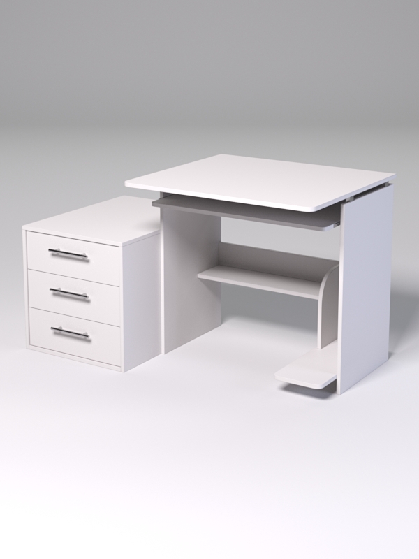 Офисный компьютерный стол подойдет для работы сотрудников различного профиля — менеджера, делопроизводителя, секретаря. Конструкция позволяет компактно организовать рабочее пространство и оборудована всем необходимым для комфортной работы. Имеется выдвижная полка под клавиатуру, подставка под системный блок, полка для хранения. Стол комплектуется тумбой с тремя выдвижными ящиками.