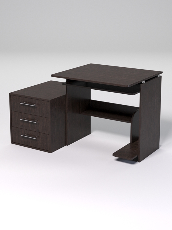 Офисный компьютерный стол подойдет для работы сотрудников различного профиля — менеджера, делопроизводителя, секретаря. Конструкция позволяет компактно организовать рабочее пространство и оборудована всем необходимым для комфортной работы. Имеется выдвижная полка под клавиатуру, подставка под системный блок, полка для хранения. Стол комплектуется тумбой с тремя выдвижными ящиками.